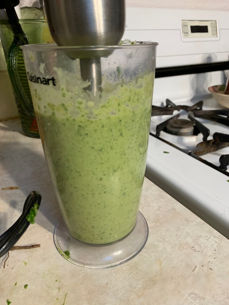 Place the following ingredients in your blending device: 2-3 handfuls of sage leaves, 1 handful of miners lettuce or another mild leafy green, 1 cup oil (I used a combo of olive and avocado), 1/4 cup water, 2 tablespoons minced garlic, salt to taste, 1/2 cup pine nuts (can substitute any other mild flavored nut such as walnuts), 1/2 cup shredded Parmesan cheese, and 1-2 tablespoons balsamic vinegar. Blend to the desired consistency–completely smooth or a little bit chunky. Add to pasta or other base. Top with meat crumbles, if desired.