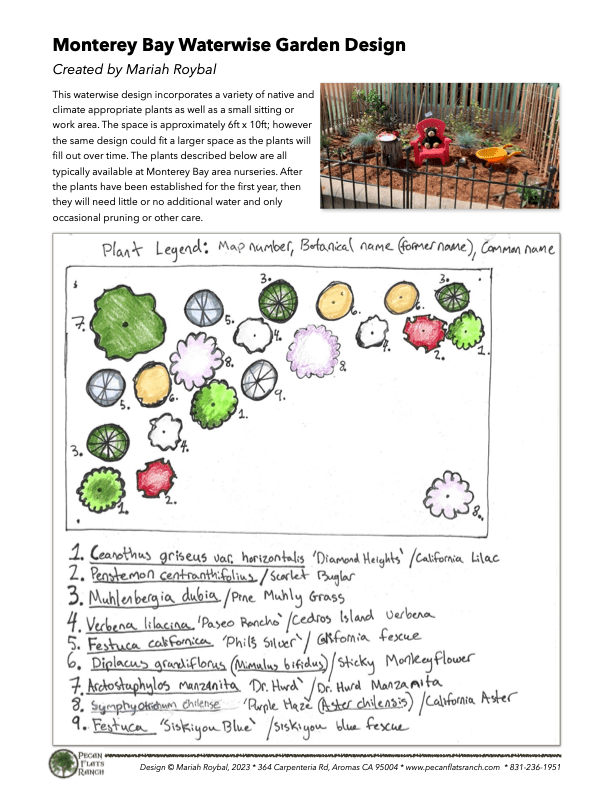 Check out this new water-wise garden design incorporating California native and climate appropriate plants, created by Mariah Roybal! The garden can be scaled up easily, as plants will fill in as they grow. Click here to download a PDF.